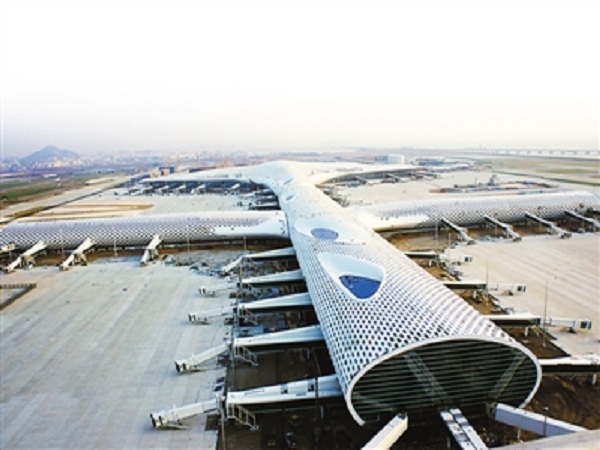 深圳機場T3航站樓是深圳寶安國際機場擴建工程的主體部分,由深圳機場T3航站樓和GTC兩個部分組成。其中T3航站樓占地19.5萬平方米,南北長約1128米,東西寬約640米,總建筑面積45.1萬平方米,方大集團承建的立面幕墻面積為16.7萬平方米,主立面采用呈60.2度傾斜的方大Low-E節能環保玻璃幕墻,既為旅客帶來更為開闊的視野,也為整個大廳帶來充足的自然光。