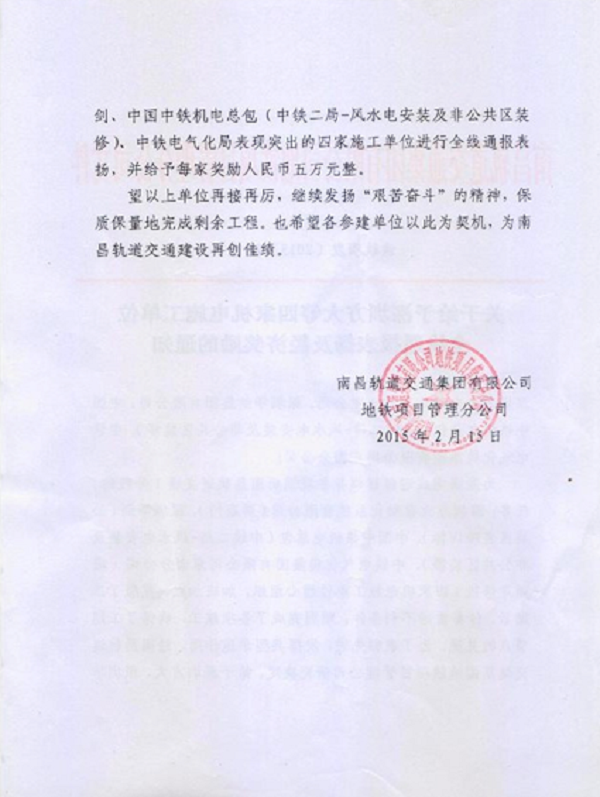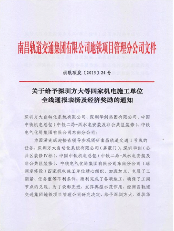 新年伊始,方大自動(dòng)化公司再次喜獲嘉獎(jiǎng)。南昌軌道交通集團(tuán)為表揚(yáng)先進(jìn),決定給予深圳市方大自動(dòng)化系統(tǒng)有限公司等四家施工單位通報(bào)表揚(yáng)。并給予五萬元獎(jiǎng)勵(lì)。