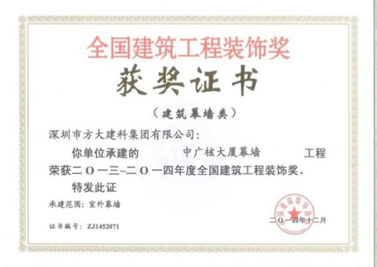 “2013-2014年度全國建筑工程裝飾獎”獲獎結(jié)果在北京揭曉,深圳市方大建科集團(tuán)有限公司榮獲四項建筑幕墻類大獎,獲獎項目分別為:中鐵南方總部大廈幕墻工程、大連萬達(dá)公館1#樓幕墻工程、嘉里建設(shè)廣場二期幕墻工程、中廣核大廈幕墻工程。