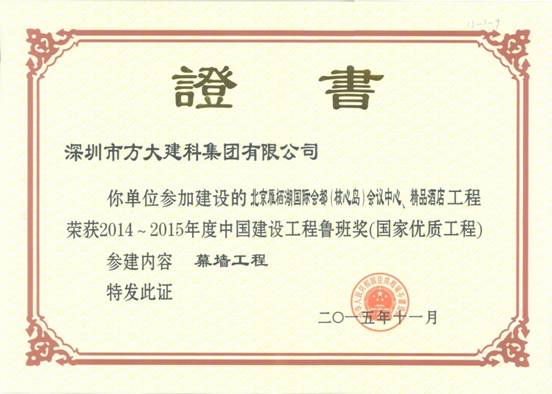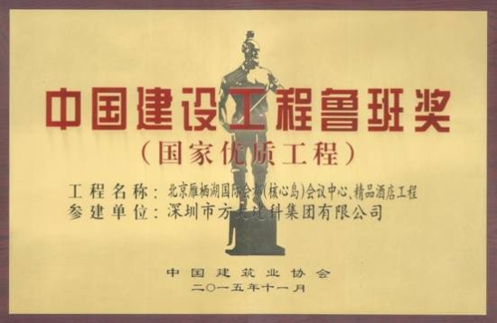 11月17日,中國(guó)建筑業(yè)協(xié)會(huì)在北京舉行中國(guó)建筑行業(yè)最高獎(jiǎng)——2014~2015年度中國(guó)建設(shè)工程魯班獎(jiǎng)(國(guó)家優(yōu)質(zhì)工程)表彰大會(huì),在本屆魯班獎(jiǎng)表彰大會(huì)中,方大集團(tuán)股份有限公司全資子公司深圳市方大建科集團(tuán)有限公司憑借精心打造的高標(biāo)準(zhǔn)、高質(zhì)量幕墻工程的北京雁棲湖國(guó)際會(huì)都精品酒店,獲得2014~2015年度中國(guó)建設(shè)工程魯班獎(jiǎng),“方大品質(zhì)”作為“深圳質(zhì)量”的典范再度被全國(guó)建筑工程領(lǐng)域所矚目。